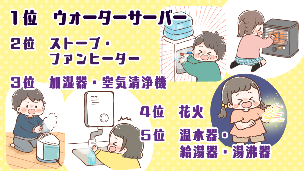1位は「ウォーターサーバー」でした。現在流通している多くの製品には、チャイルドロック機能が搭載されていますが、子どもがロックを外してしまい、熱湯を被る事故が発生しています。