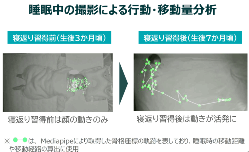 寝返りを習得した子どもは睡眠中も活発に動き、5時間で最大15mも移動することが確認されています。