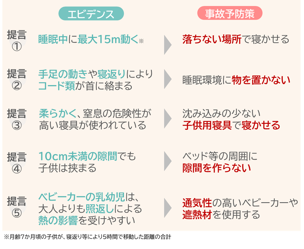 今回の調査では、最近開発された画像処理技術を用いた分析を行っています。その結果、寝返りができない子どもでも1時間に数センチ移動すること、寝返りができる子どもは1時間に3メートルも移動することが分かりました。一晩で、子どもは意外と大きく移動します。そのため、乳幼児用ベッドで移動範囲を制限することや、危険な隙間を無くすことなど、日ごろの睡眠環境を確認することが重要です。