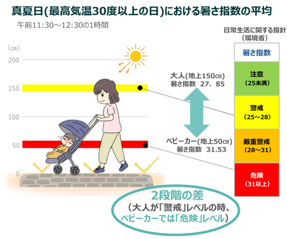 ベビーカーで移動する子どもは大人よりも地面からの熱の影響を受けやすいことが確認されています。