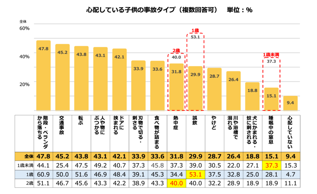 また、このアンケート結果を子どもの年齢別で見ると、1歳未満は「睡眠中の窒息」、1歳児は「誤飲」、2歳児は「熱中症」などが他の年齢層よりも多くなっており、子どもが成長していくにつれて、保護者が心配する事故は変化していくことが分かります。このため、日頃から子どもの年齢等に合った事故予防策についての情報や知識を得るよう心がけておくことが大切になります。
