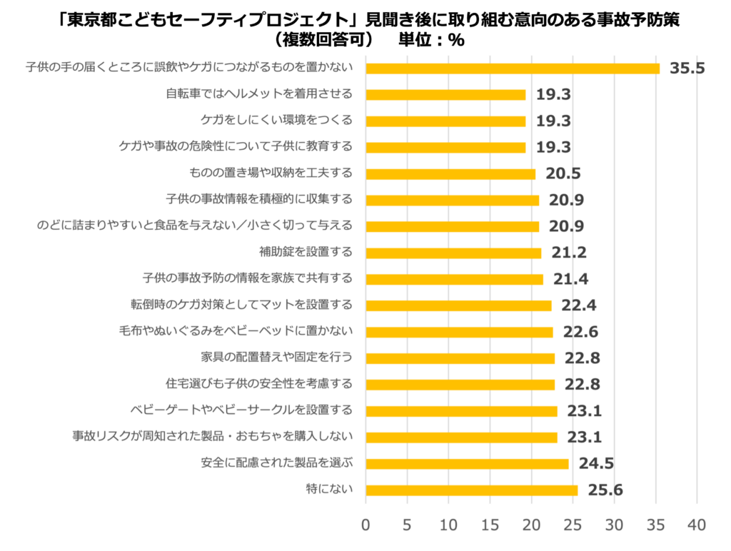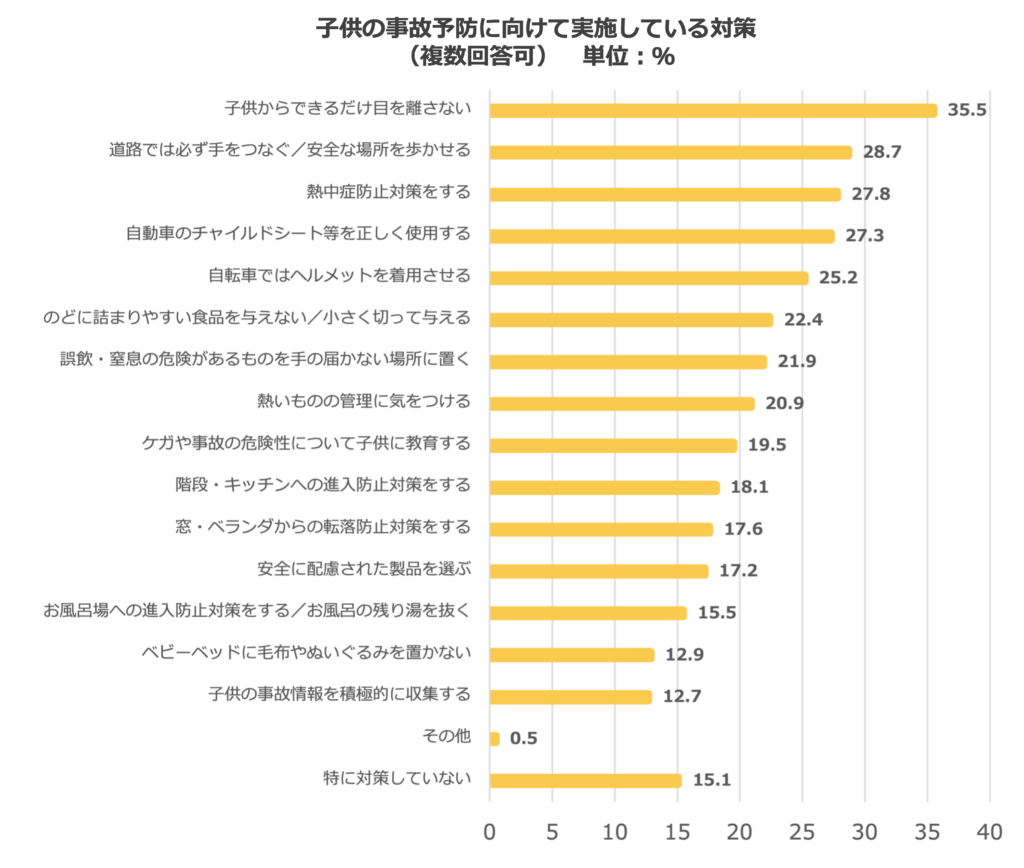 「子供の手の届くところに、誤飲やケガにつながるものを置かない」が35.5%と最も高く、他にも、単なる見守りにとどまらず「変えられるものを変える」という安全な「環境づくり」に着目した予防策に目を向けていただけている様子がうかがえます。