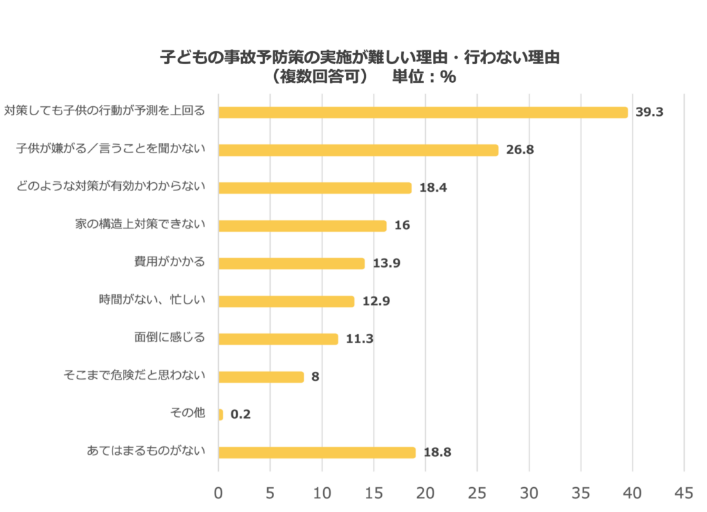 「対策しても⼦供の⾏動が予測を上回る」が39.3%で最も⾼く、続いて「子供が嫌がる/⾔うことを聞かない」が26.8%、「どのような対策が有効かわからない」が18.4%となっています。このことから、子どもの行動特性やそれに応じた予防策についての理解を深めることで、予防策の実践につながる可能性が見えてきます。